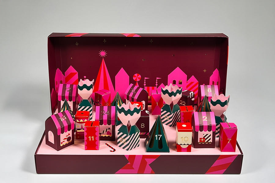MR Cakes julkalender sticker ut genom att kombinera hållbar design, smart konstruktion och en unik konsumentupplevelse. Kalendern består av en lock- och bottenförpackning i FSC-certifierad kartong, med ett färgstarkt tryck som direkt förmedlar MR Cakes välkända identitet. Vid öppning möts konsumenten av en tredimensionell stadssilhuett i starka julfärger och guldfolie, där varje lucka framträder som ett eget litet konstverk. De individuella luckorna har unika former, från granar och paket till karaktärer – alla försedda med siffror i guldfoliering som ger ett exklusivt uttryck.