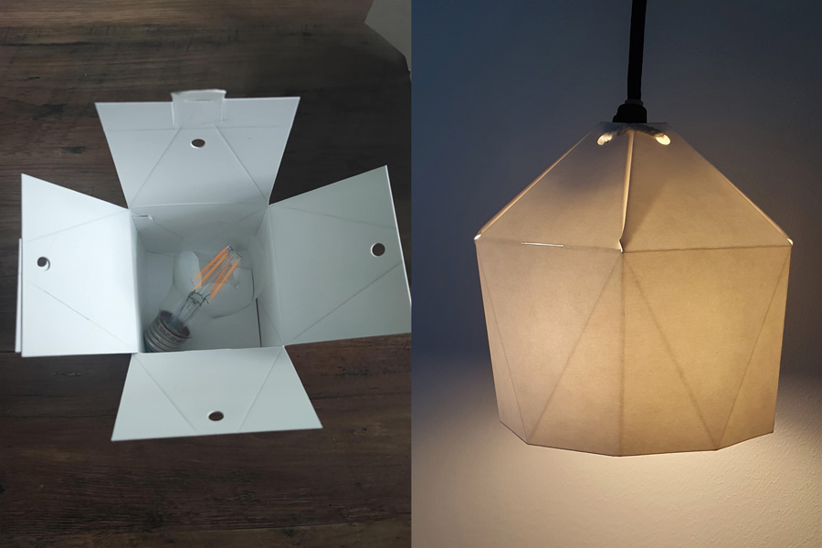 Konstruktionen är dessutom utformad för att fungera utan lim eller andra extra material för att kunna stängas vid packning och omformas till lampskärm.