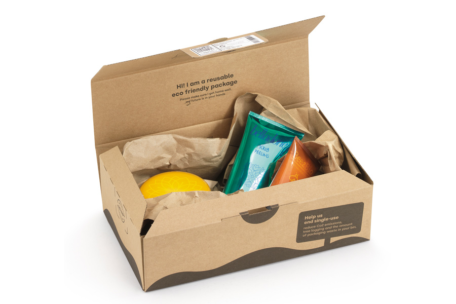 Gratis och enkel retur för kunden, tack vare den tryckta QR-koden. Kunden kan enkelt vika ihop lådan, skanna den och returnera den via särskilda insamlingsställen.